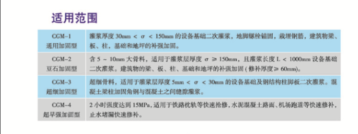 灌漿厚度30mm<δ<150mm設備基礎二次灌漿,地腳螺栓錨固,栽埋鋼筋,建筑物梁、板、柱、基礎和地坪的補強加固。